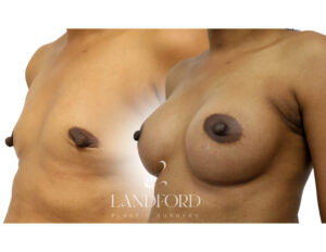 Case Details: 48-year-old patient with minimal breast tissue and small breasts, who sought to achieve a fuller look. The patient ‘s aim was to wear a C cup bra and fill her bathing suit. Dr. Landford performed a breast augmentation using 345cc smooth round full profile silicone implants that were placed under the muscle. Results shown are 8 weeks post-procedure.